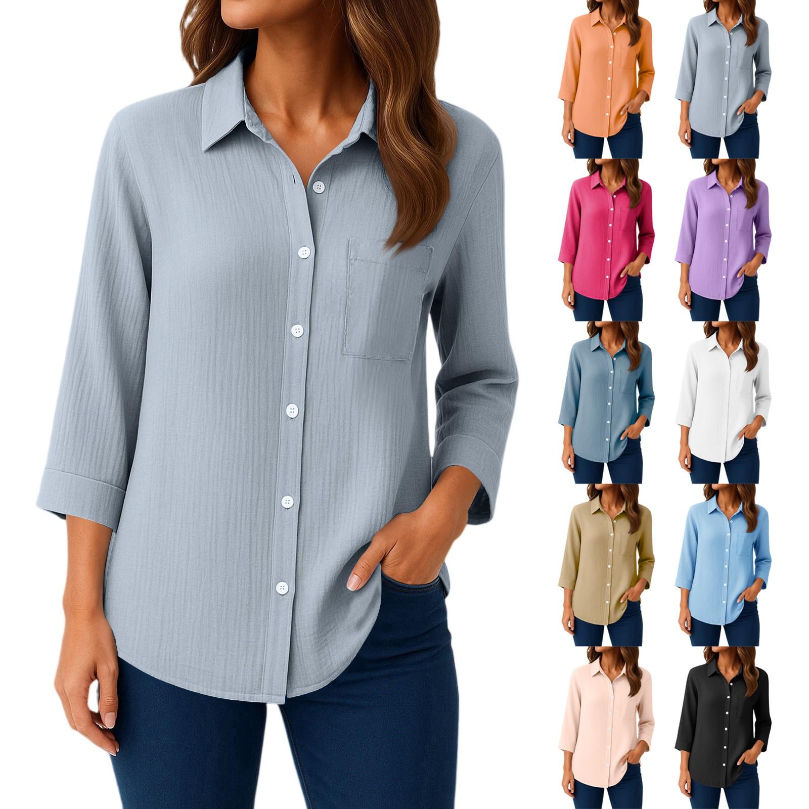 Womens Button Down Shirts 3/4 Sleeve Casual Collared Shirt Loose Blouses Solid Color Tops With Pocket cm
