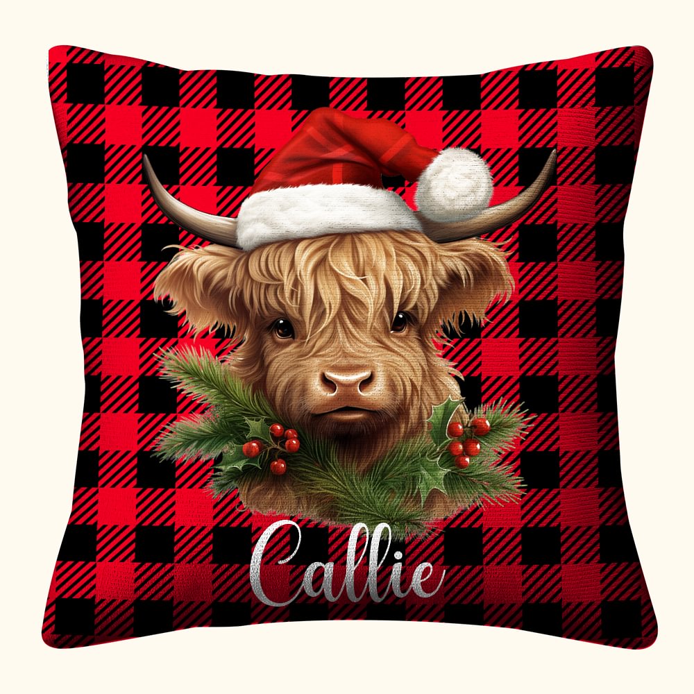 Personalizzato Holly Santa Hat Highland Cow Colorful Plaid Throw Pillow Cover con nome Home Decor Compleanno regalo di Natale per gli amanti delle muc