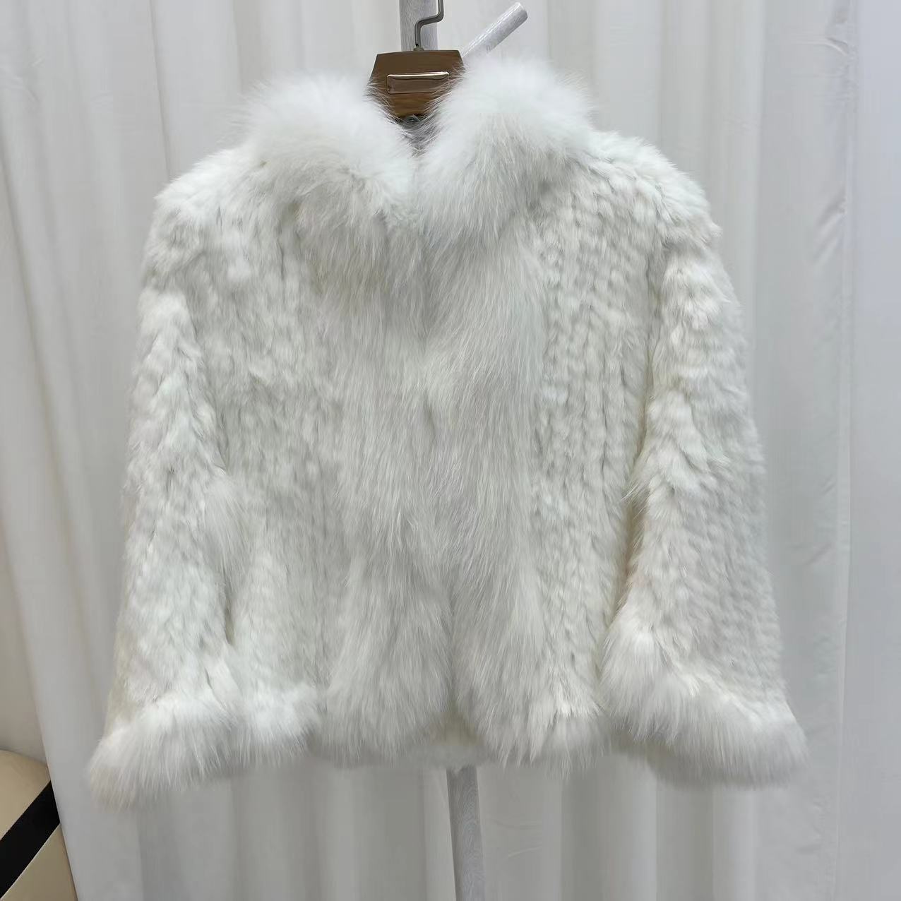 Real Rabbit Fur Braided Coat for Women Short Style Young Coat Fox Fur Bat Sleeve Shawl cm black