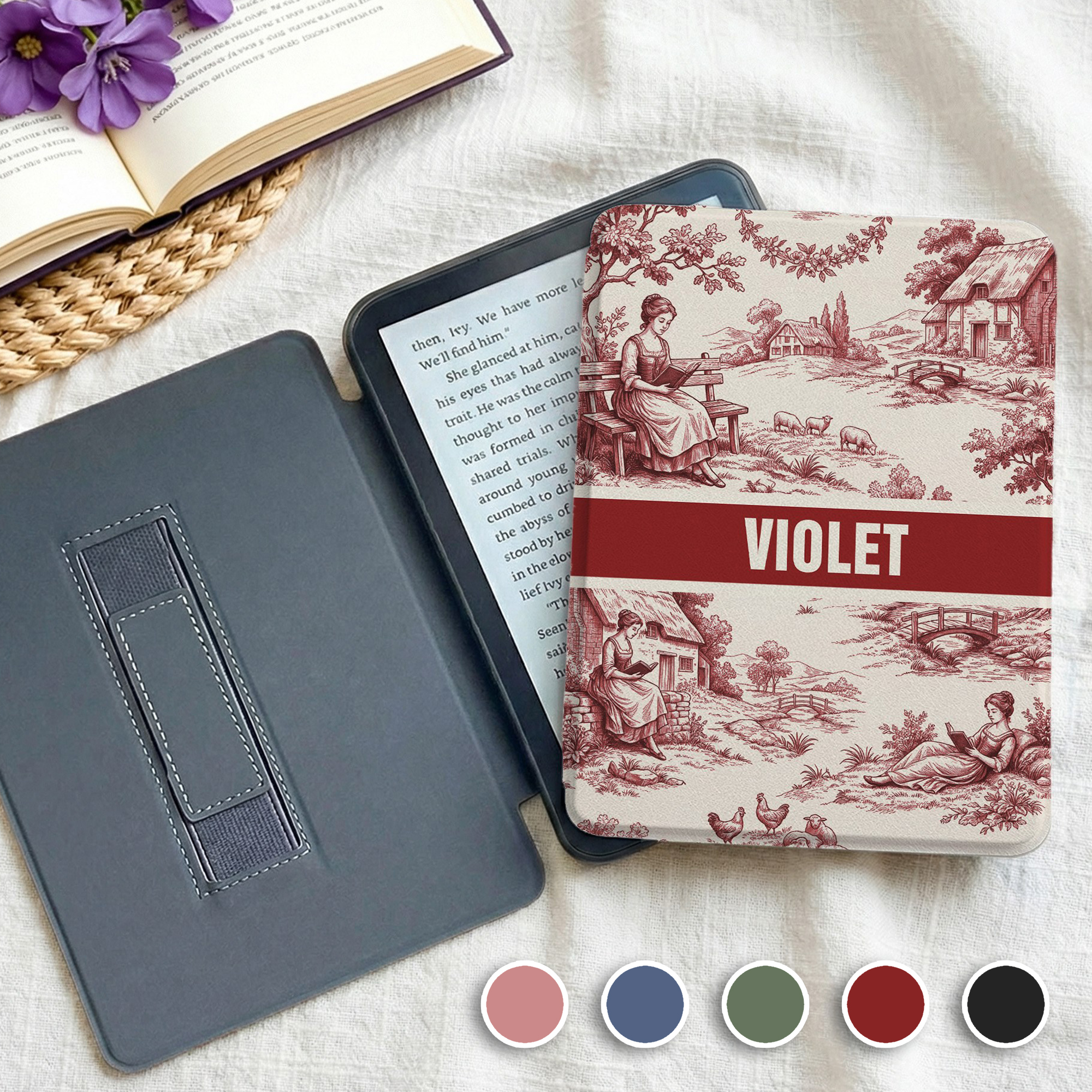 Funda portátil Kindle personalizada estilo Vintage Toile De Jouy para mujer con nombre y correa para uso diario Regalo de cumpleaños para ratones de biblioteca