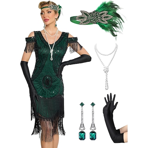 Set Anni Ruggenti Anni 1920 Abito da cocktail Lunghezza al ginocchio Abito Flapper Vestito Abiti con accessori Spalle scoperte Maniche corte Il grande Gatsby Charleston Paillettes Frangia con nappe