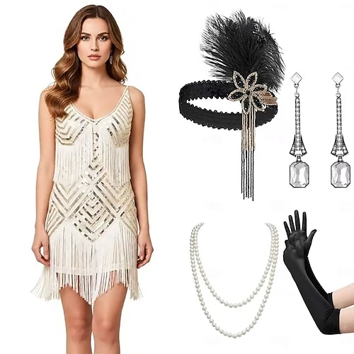 Set Anni Ruggenti Anni 1920 Abito da cocktail Mini Abito Flapper Vestito Abiti con accessori Senza maniche Il grande Gatsby Charleston Paillettes Frangia con nappe Piuma Scollo a V profondo Costume