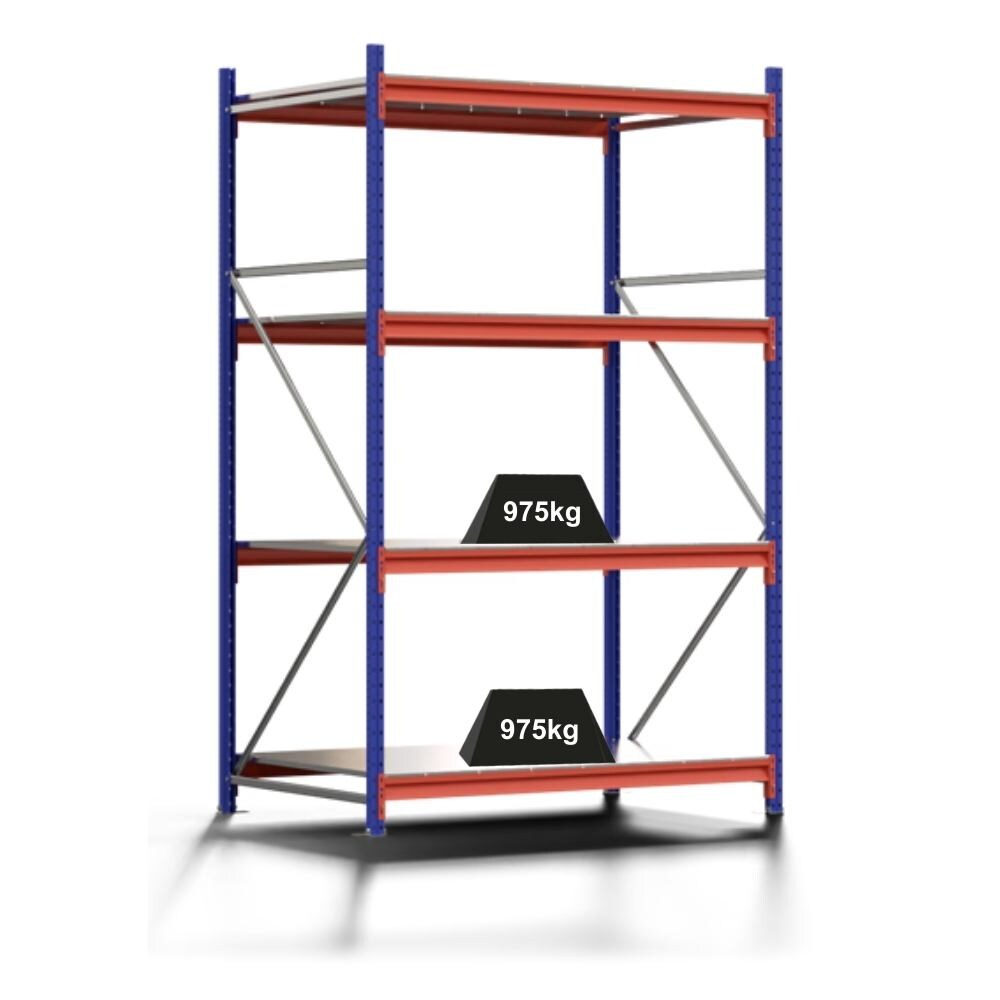 PROREGAL Weitspannregal MOOSE Stecksystem Omega-Profil, Grundregal, HxBxT 250x150x100cm, 4 Ebenen, Spanplatten-Fachboden, Fachlast 975kg, Blau/Orange