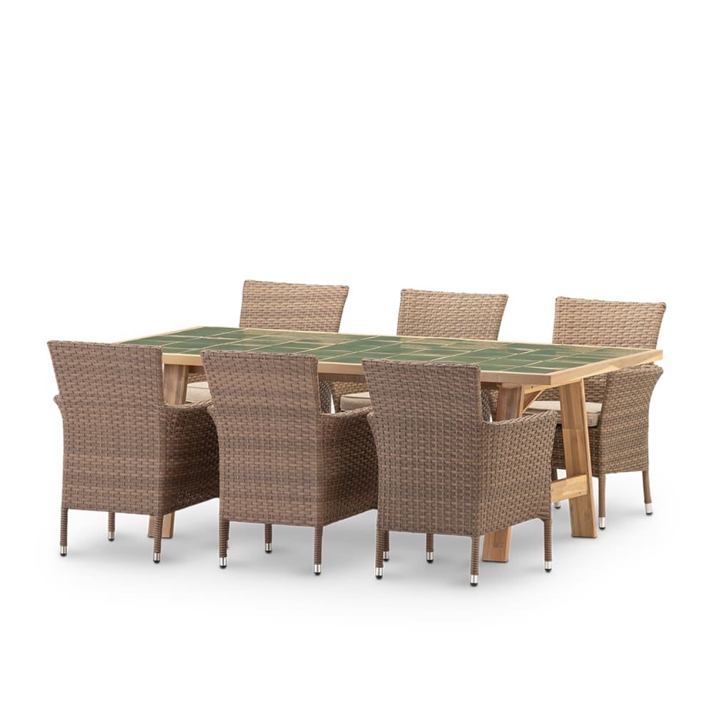 Set tavolo ceramica verde 205x105 + 6 sedie rattan sintetico