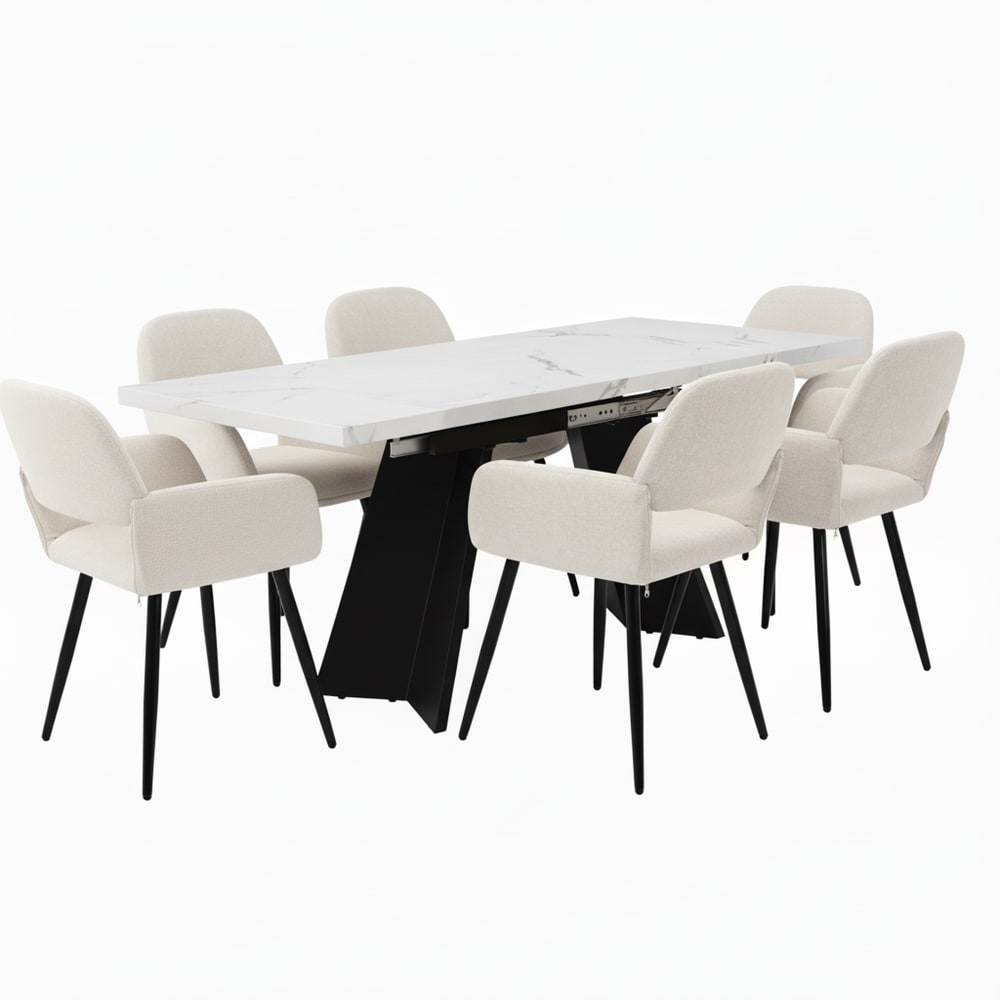 Tavolo da pranzo allungabile con effetto marmo bianco e 6 sedie beige