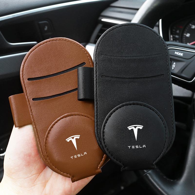 Solskjerm til bil, oppbevaringsboks for briller, solbrilleklemme, kortholder for billetter til Tesla Model 3 Model S Model Y X Roadster brun