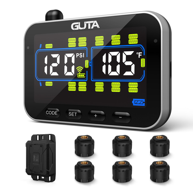 GUTA Wohnmobil/Anhänger Reifendruckkontrollsystem mit 6 Sensoren, 0-188PSI Echtzeitüberwachung, 6 Alarme, LCD-Farbbildschirm, Repeater, Fernkommunikation, Unterstützt bis zu 24 Reifen, GT20C+6GS02+GB30