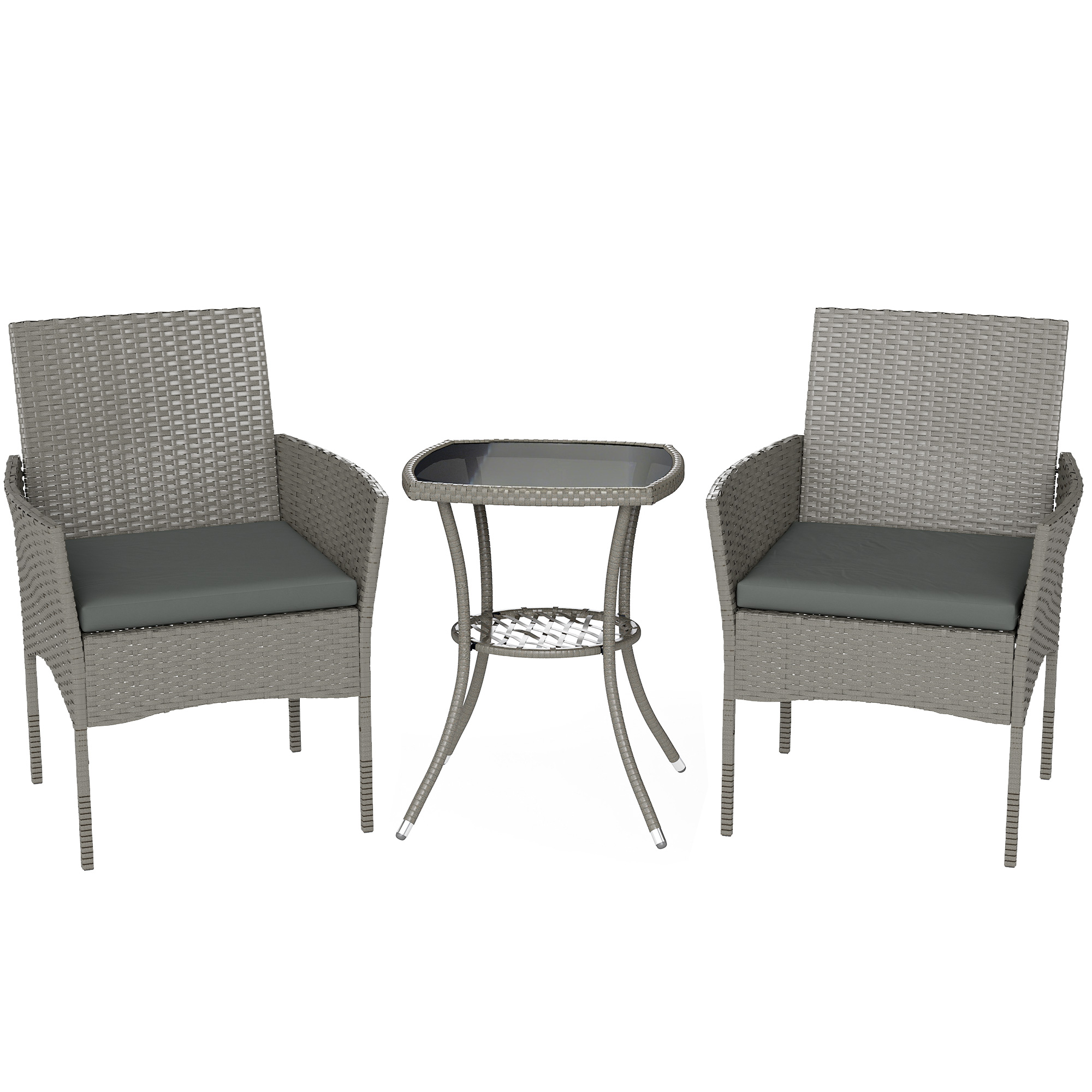 Outsunny 3 Piece Rattan Bistro Set, PE Wicker Garden Furniture Conversation Set with 2 Tier Glass-Top Table, Chairs, Dark Grey