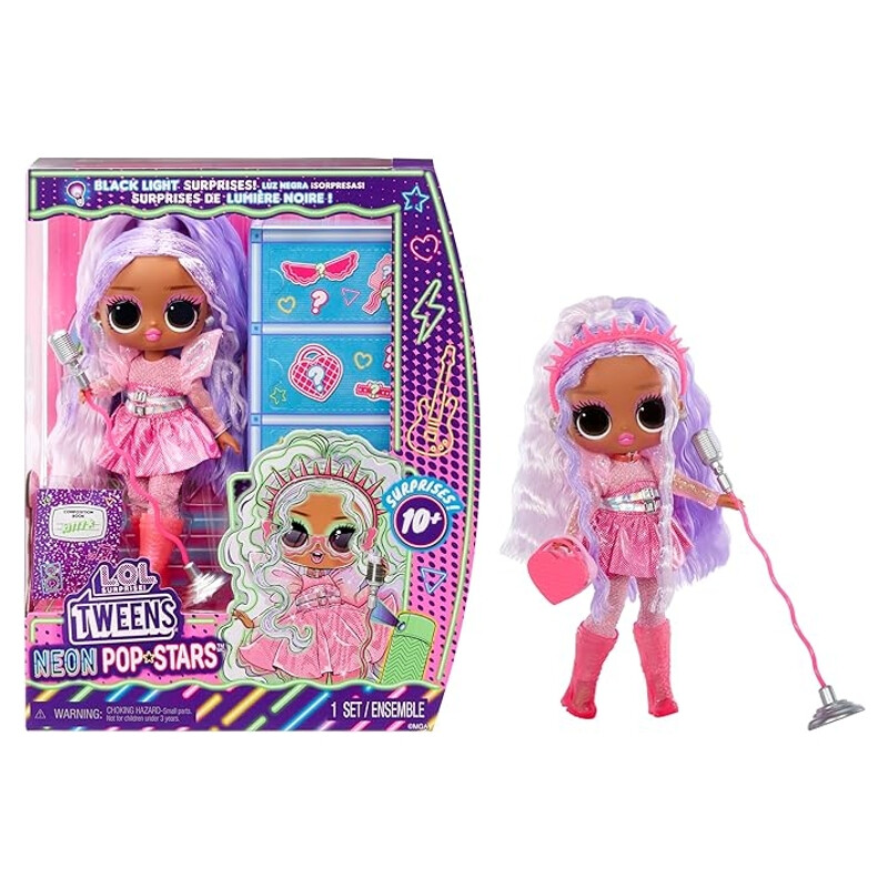 L.O.L. Surprise! Tweens Neon Pop Stars - Kitty K - 1 Modepuppe mit Backlight Surprises und 10+ Pop Star Fashions und Accessoires Inklusive Retro Mikro-Ständer, Geschenk für Kinder ab 4