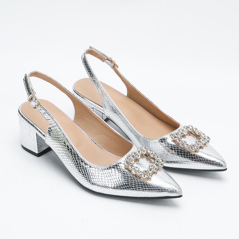 Mode Lyx Silver Krokodil Pumps Kvinnor Bred Passform Höga Klackar Sandaler Kristallspänne Slingback Tacones Traf Brud Bröllopsskor Damer cm silver