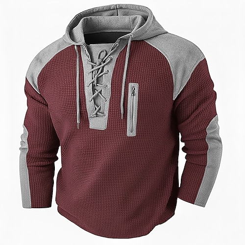 Per uomo Maglietta Waffle Maglietta Maglia Henley a nido d'ape Manica Lunga Con Cappuccio Collo con lacci Autunno Tinta unica Testurizzato Tradizionale / Vintage Coulisse Casuale Casa All'aperto Blu