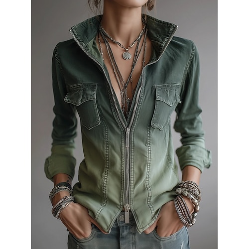 Per donna Camicia Camicia casual Blusa Cerniera Tasca Ombre Vintage Elegante Classico Manica Lunga Collo alla coreana Top Regolari Quotidiano Ferie Uscire Verde Primavera Autunno