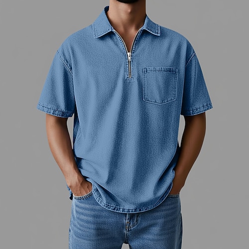 Per uomo Polo con zip Polo in Cotone Casuale Ferie Con cerniera Bavero Manica Corta Moda Essenziale Semplice Zip a un quarto Estate Primavera Primavera Estate Vestibilità comoda Blu chiaro Esercito