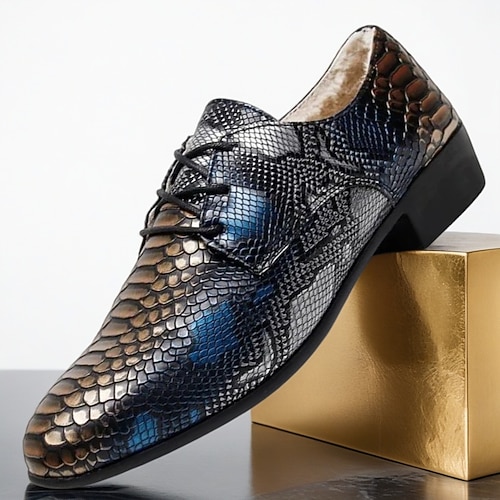 scarpe eleganti da uomo in similpelle blu e grigia con stampa serpente, moderne sneakers alla moda con lacci per locali notturni, eventi di moda e outfit audaci