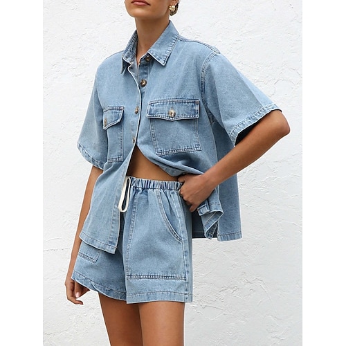 Per donna Set di Pantaloncini Bolero Top Manica Corta Colletto a Camicia Semplice Moda Streetwear Casuale Quotidiano All'aperto Blu Nero Blu marino Estate Vestibilità regolare