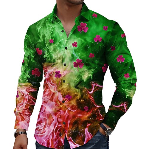Camicia illusion ottica trifoglio fiamma da uomo del giorno di San Patrizio Camicia con bottoni Maniche lunghe Stile vintage retrò Festa Primavera Autunno Colletto a risvolto Stampa 3D Camicie con