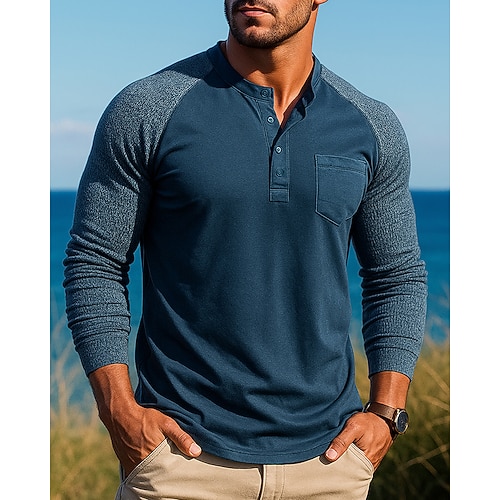 Per uomo Camicia da escursionismo Camicia Henley Manica Lunga Colletto Henley Top Esterno Traspirante Inverno Misto Cotone Patchwork Blu Cachi Blu scuro Tennis Golf Corsa