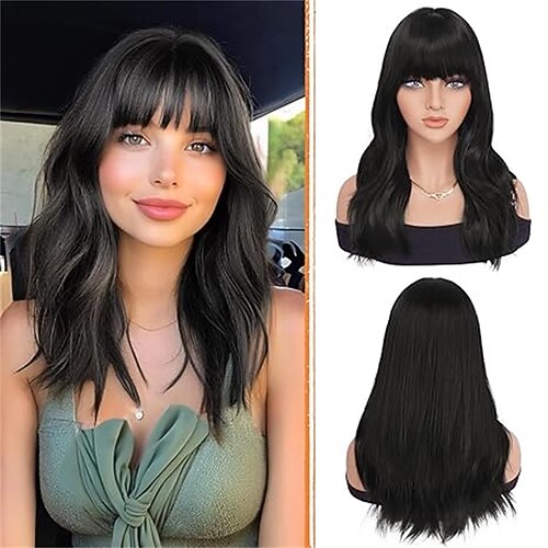 Parrucche marroni con frangia - parrucche sintetiche ondulate naturali da 19 pollici resistenti al calore, di media lunghezza, per donne, per feste quotidiane, bionde, castane miste
