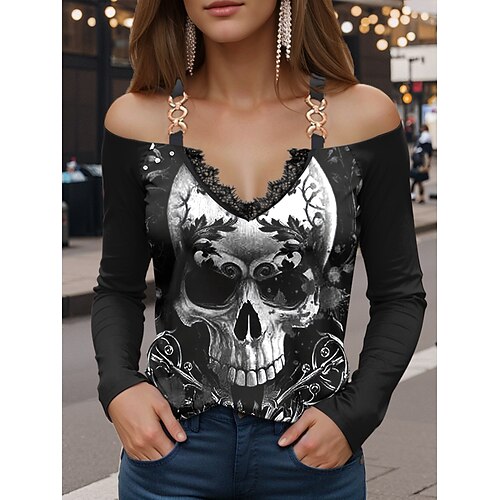 Blusa Donna Stampa Floreale Teschi Grafica Teschio Vintage Elegante Casual Manica Lunga Collo a V Maglie Regolari Quotidiane Uscita Stampa Patchwork Bianco Rosso Vino Viola Khaki Primavera Autunno