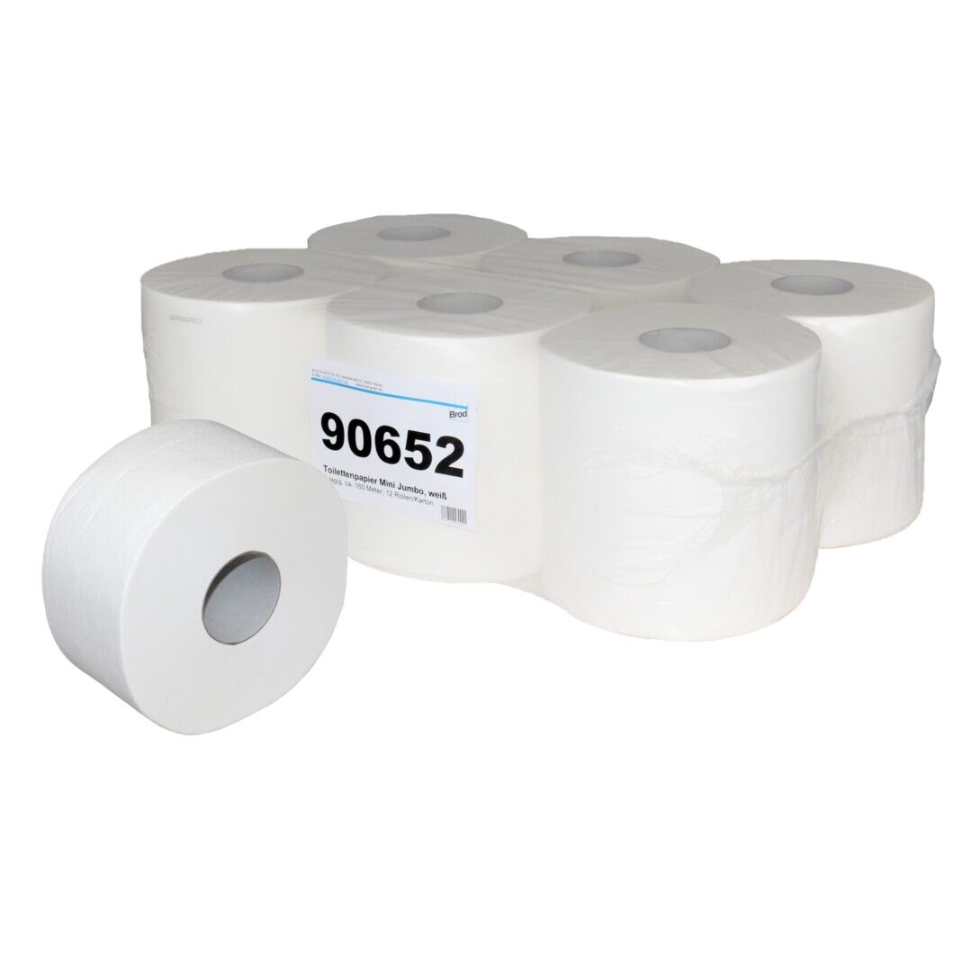 Toilettenpapier Brod, Mini-Jumborolle, weiß, 100 % Zellstoff, 2-lagig, 890 Blatt, 160 m, 12 Rollen im Folienpack
