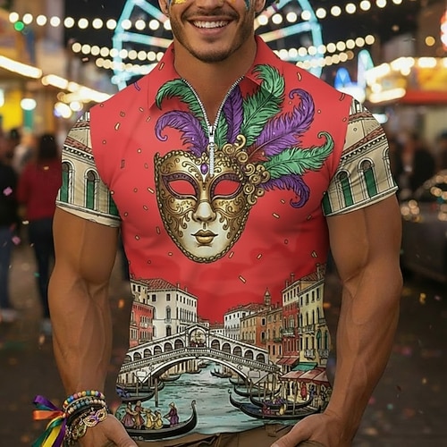 Per uomo Polo Polo con zip a un quarto Quotidiano Carnevale Zip a un quarto Manica Corta Moda Essenziale Grafico Maschera Stampa 3D Estate Primavera Vestibilità regolare Giallo Rosso Viola Polo