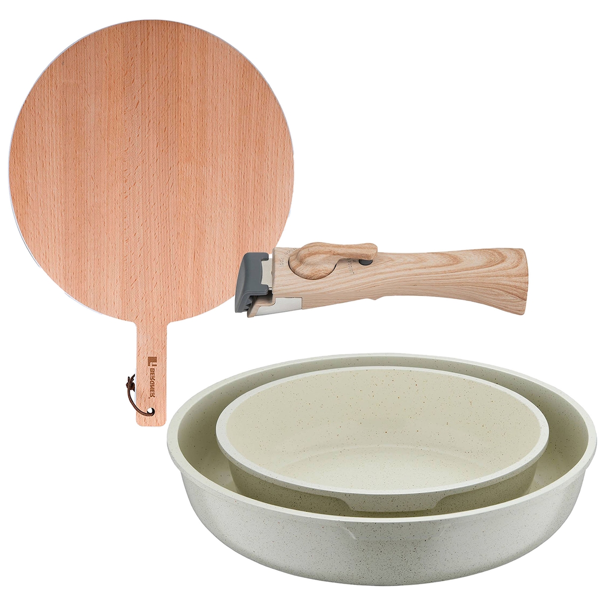 BERGNER - Set mit 2 Bratpfannen Ø22/26cm aus Aluminiumguss, weiß, mit abnehmbarem Griff mit Rundes Schneidebrett 38x28x1,5 cm aus Buchenholz