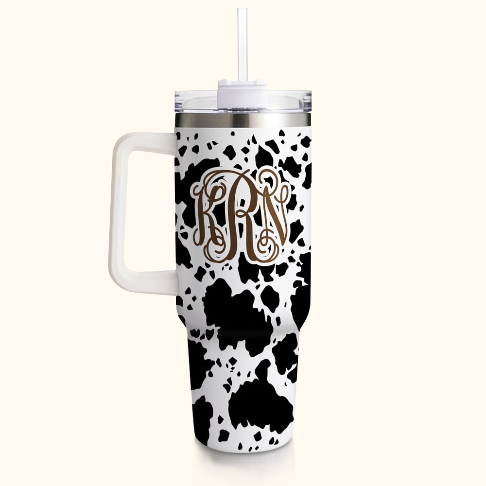 Mucca personalizzata con stampa leopardo Monogram 40 oz Tumbler isolato con coperchio, cannuccia e manico Regalo di compleanno per Cowboys Cowgirls