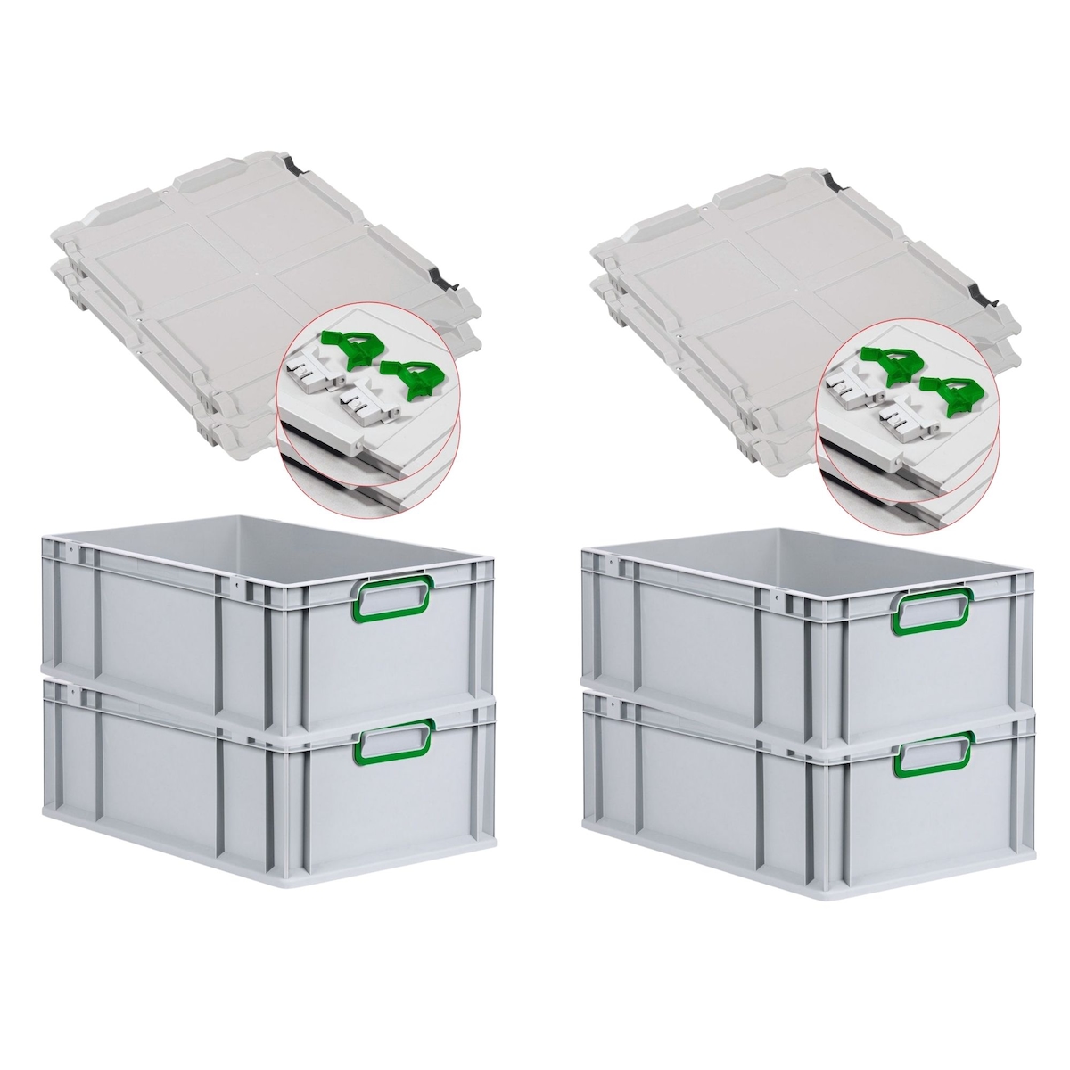 PROREGAL 4x Eurobox NextGen Color mit Scharnierdeckel & Verschlüssen | HxBxT 22x40x60cm | 44 Liter | Griffe grün geschlossen | Verstärkter Boden