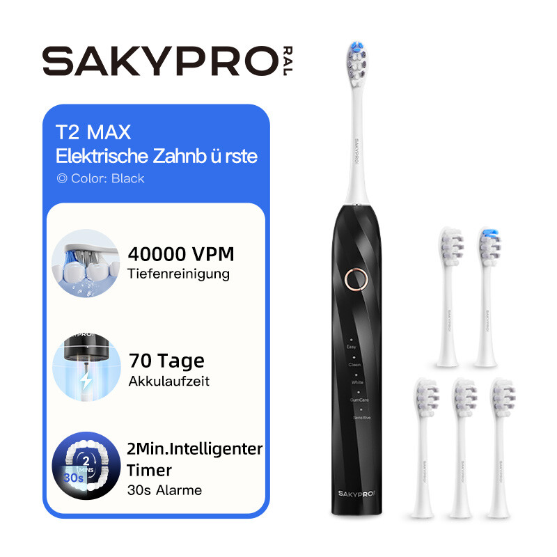 SAKYPRORAL Smarte Elektrische Zahnbürste, 6 Bürstenköpfe, 5 Putzmodi, 75-Tage ultra-lange Akkulaufzeit, intelligenter Timer, unverzichtbar für Mundhygiene, Schwarz