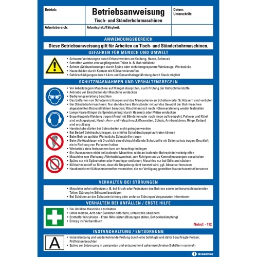 König Werbeanlagen Dreifke® Maschinenbetriebsanweisung Tisch- und Ständerbohrmaschinen, Kunststoff, 210x297mm, ASR A1.3, DIN EN ISO 7010