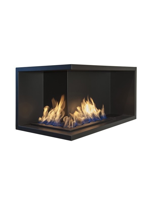 OutInFire CORN 120 – Eck-Biokamin mit Schutzglas. Eingebauter mattschwarzer Bioethanol-Kamin. Rechte Öffnung