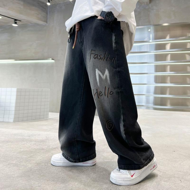 Guttejeans høst 2025: Fasjonable bukser med vide ben for mellomstore og store barn 120cm Svart