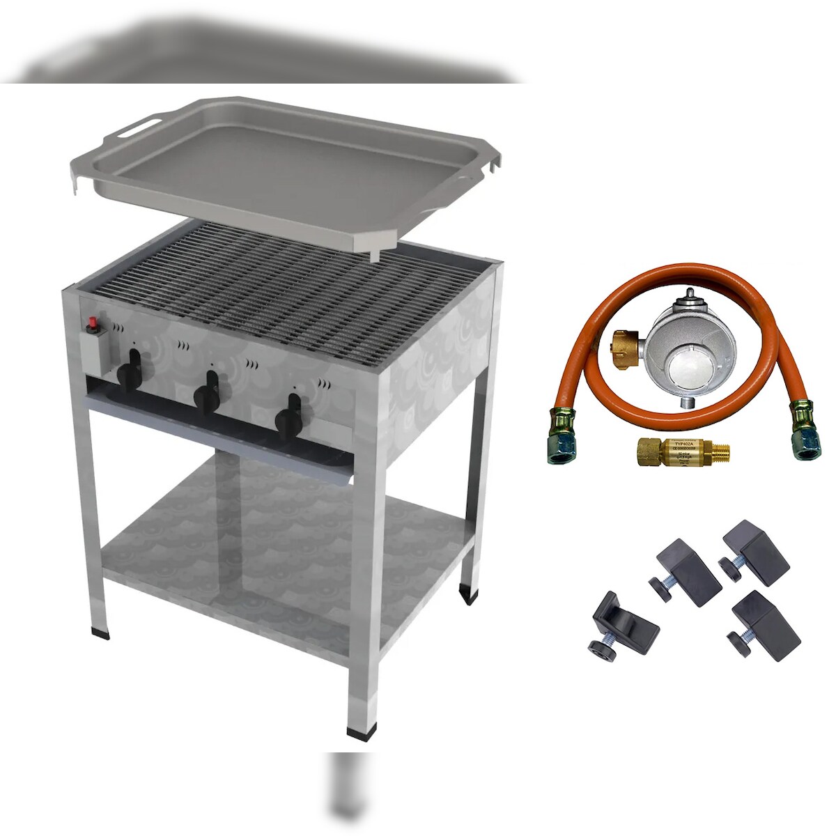 ChattenGlut ChattenTec Professional doppelwandiger Gastrobräter 3-flammig Standgerät 12 kW, Flüssiggas 650x530x830 mm mit Gewerberegler und Rost