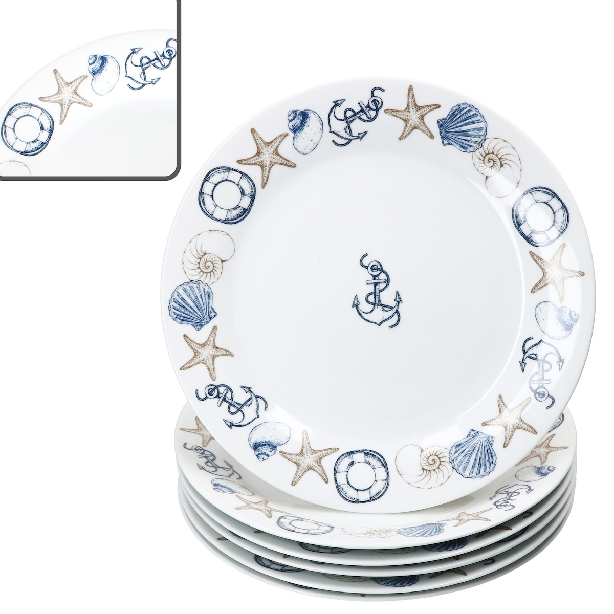 Neptun 6er Set Speiseteller Ø27cm Porzellan Platte groß Essteller maritim Anker