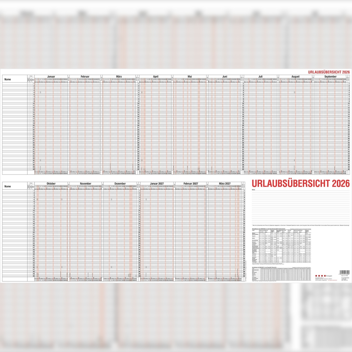 2026 Güss Urlaubsübersicht A1 für 40 Mitarbeiter im Versandrohr