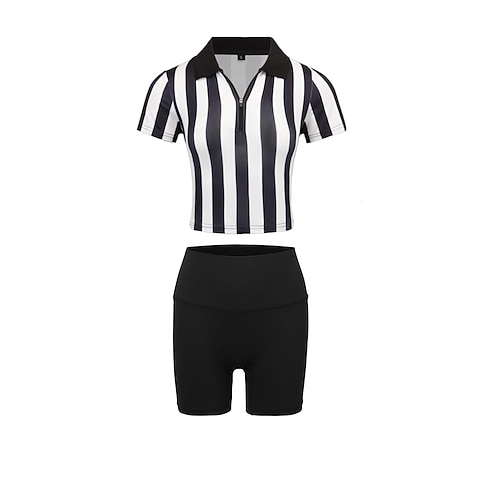 uniforme da arbitro a righe bianche e nere con cerniera e colletto da donna, uniforme da ballo e pantaloncini da yoga neri