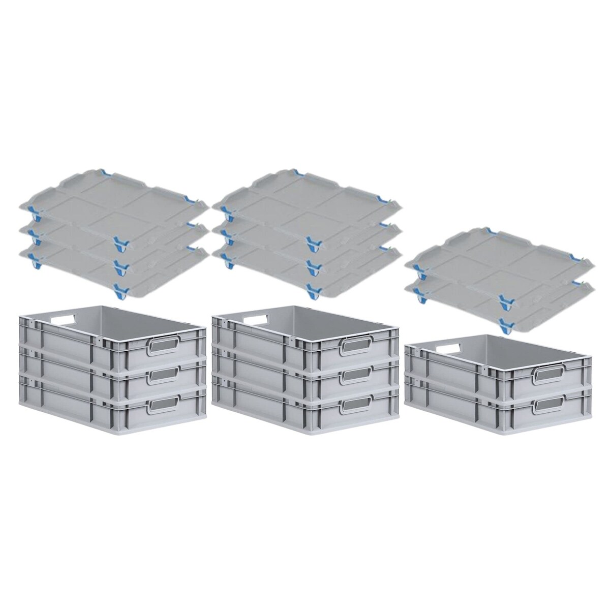 PROREGAL SuperSparSet 8x Eurobox NextGen Economy mit Auflagedeckel & 4x Verschlüsse Blau, Griffe offen, HxBxT 12x40x60cm, 23L, Eurobehälter, Box