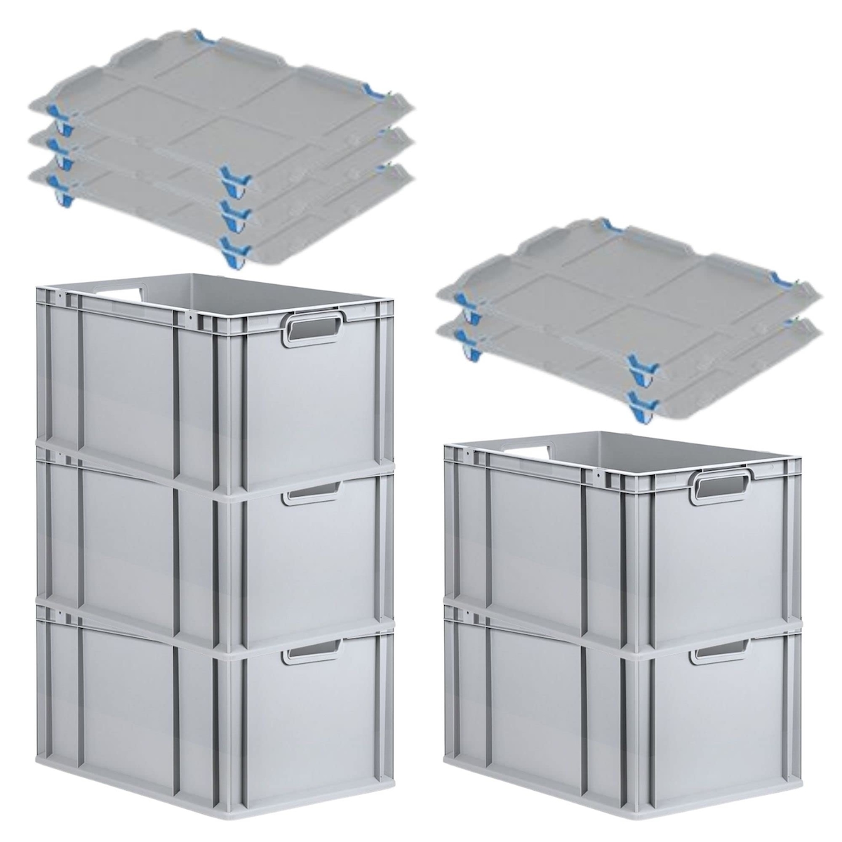 PROREGAL SparSet 5x Eurobox NextGen Economy mit Auflagedeckel & 4x Verschlüsse Blau, Griffe offen, HxBxT 32x40x60cm, 65L, Eurobehälter, Box