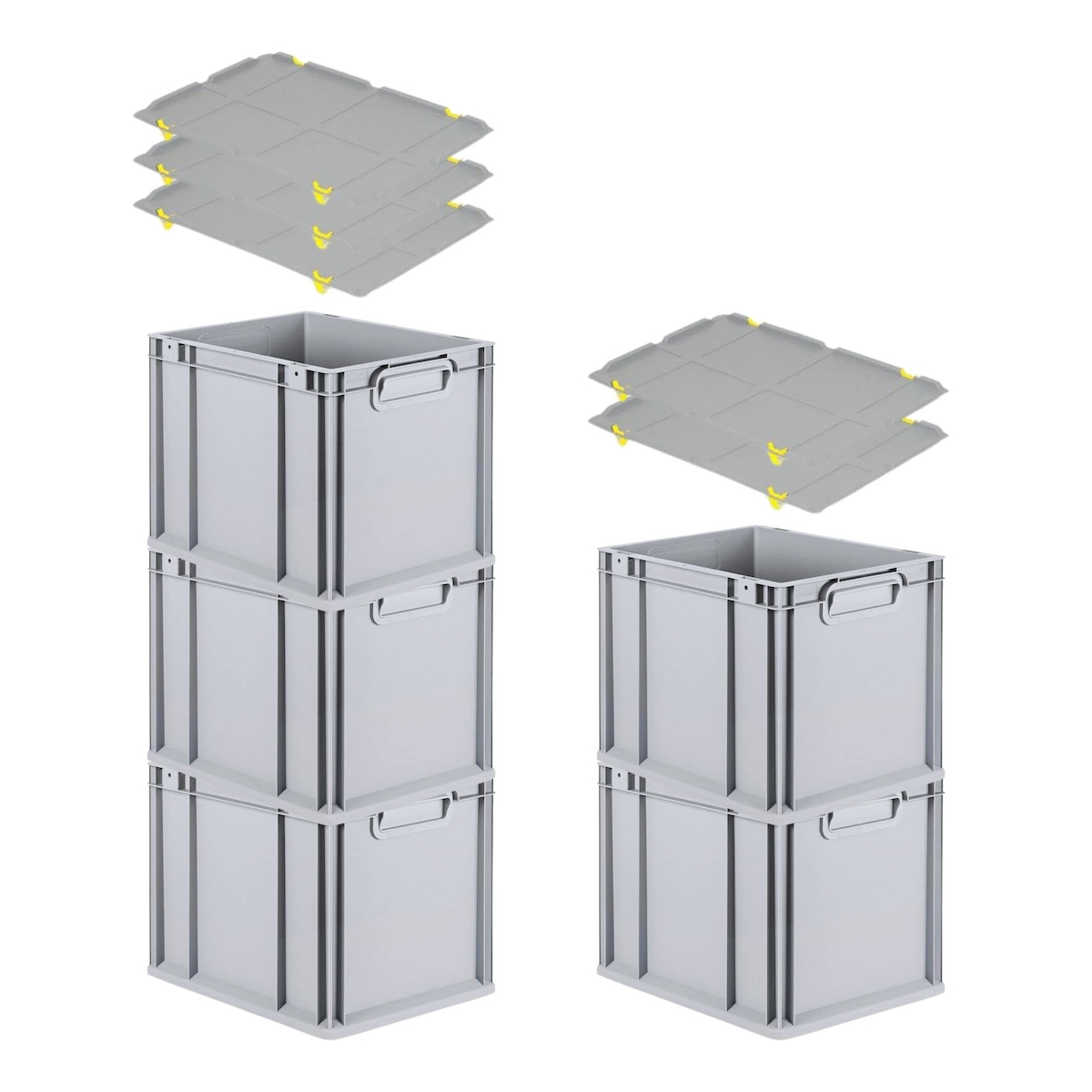 PROREGAL SparSet 5x Eurobox NextGen Economy mit Auflagedeckel & 4x Verschlüsse Gelb, Griffe zu, HxBxT 32x30x40cm, 30L, Eurobehälter, Box