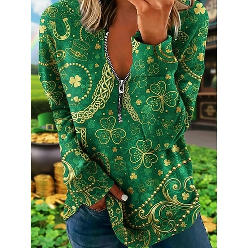 Felpa da donna per San Patrizio, stile trifoglio, casual, manica lunga, scollo a V, da strada, da indossare tutti i giorni, con cerniera, tasca, stampa, verde