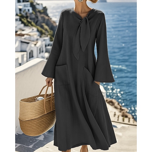 Per donna Abito Midi Misto cotone Vestito Casual Elegante Moda Moderno Quotidiano Vacanza Uscire Vestibilità comoda Semplice Manica Lunga Girocollo Blu Nero Bianco Cachi Primavera Autunno