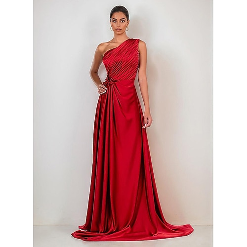 Linea ad A Strascico a Terra Abito da Sera Da principessa Abito formale Elegante Setoso Senza Maniche Monospalla Matrimonio Formale Raso con Fiori 3D Pieghe