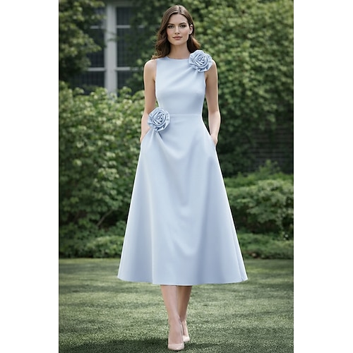 Linea ad A Lunghezza Tè Abiti da Cocktail Abiti per invitati a matrimoni Elegante Senza Maniche Girocollo Festa in giardino Formale Raso con Fiori 3D Arricciato Tasca