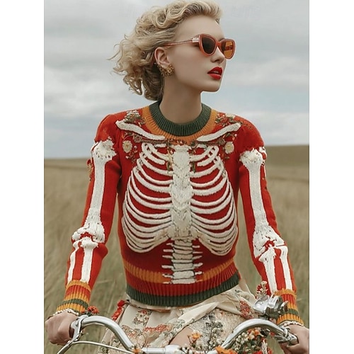 Maglione da donna grafica di scheletri moda casual collo rotondo lavorato a maglia maniche lunghe top regolari lavorato a maglia rosso blu autunno inverno