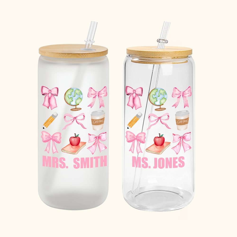 Bicchiere di vetro personalizzato con nome e cognome per la matita Coquette Bow Pink Bow-tie Regalo di ritorno a scuola per l'insegnante
