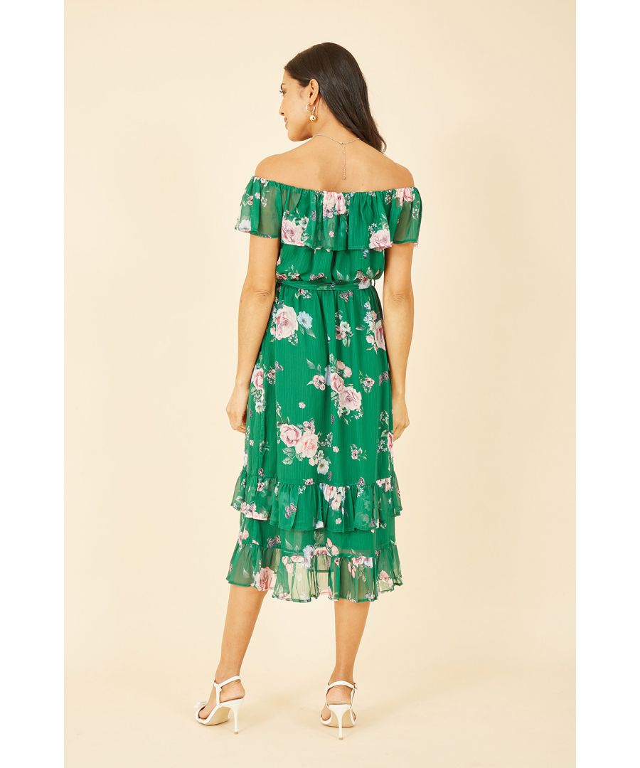 Yumi Womens Green Floral Bardot Midi Dress With Frill Hem - Size 8 UK | Yumi Sale | Discount Designer Brands
