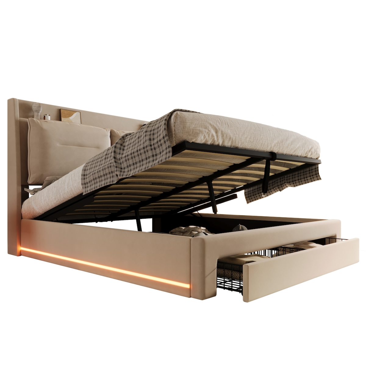 OKWISH Modernes Polsterbett mit Bettkasten Stauraum Schubladen Kopfteil Ablage LED Beleuchtung Velours Lattenrost 190 x 140 cm Beige