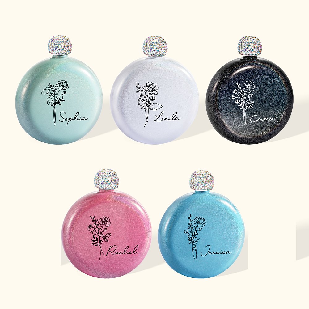 Fiaschetta tonda personalizzata con coperchio in strass e nome per la festa di compleanno della damigella d'onore.