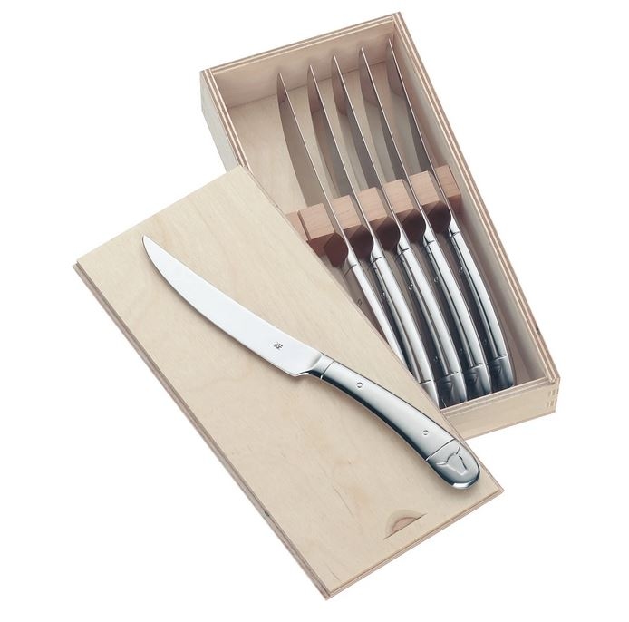 WMF Steakmesser Set 6-teilig, Cromargan Edelstahl poliert, Wellenschliff, spülmaschinengeeignet, in Holzbox