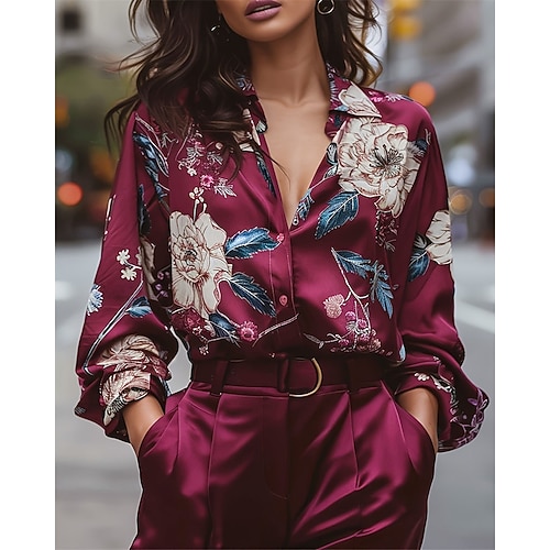 Per donna Camicia Elegant Raso/Satin Top estivi Floreale Grafico Semplice Elegante Vintage Signore Manica Lunga Colletto a Camicia Top Regolari Quotidiano Lavoro Ferie Arricciato Patchwork Bottoni